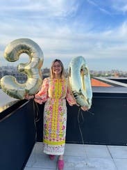 Wore this to my brother’s wedding in August and absolutely loved it! The pattern is so beautiful and fun, and I loved the cutout design. Arms felt slightly tight when dancing but didn’t stop me from having a good time!