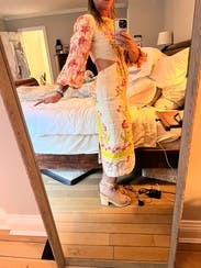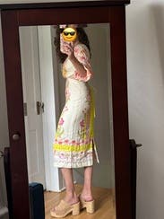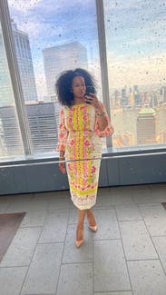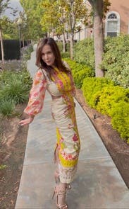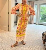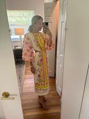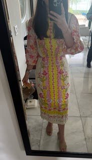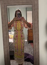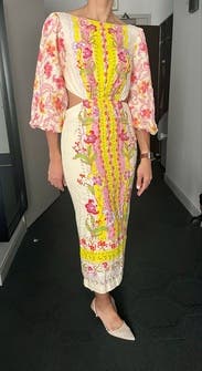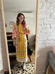 This dress is even prettier in person, bright, cheerful, and perfect for spring or summer events. The embroidery and vibrant colors make it stand out without being too loud. The side cutouts add a fun, flirty touch but still feel tasteful. I wore it with platform wedges, which worked perfectly with the midi length. The fabric has a nice structure to it, and I felt very put together. It’s comfortable to wear all evening, though it’s slightly more fitted through the hips than expected something to note if you’re between sizes. Got tons of compliments and felt really confident in it. Would definitely rent again!