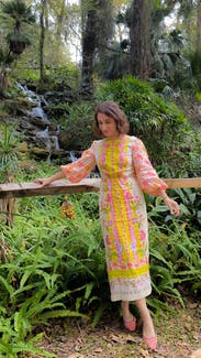 I wore this to a fancy garden golden birthday party for my best friend, and I received endless compliments! I ordered both a size 2 and 4, and the 2 fit perfectly like a glove. So much so that I didn’t even worry about a bra or breast tape, which is extremely rare considering my larger sized chest and petite frame. The quality cannot be beat. Also the coloring is FIRE (even though I tend to be drawn towards neutrals to blues/lavenders; these highlighter tones over the neutral linen was so beautiful and unique).