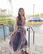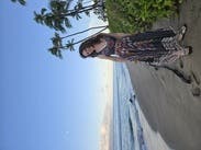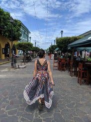 The fabric is perfect for a warm weather vacation! The pattern and hem are fun. Just be aware there isn’t any stretch and it does run small.