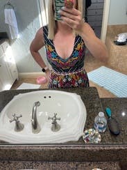 When I saw this dress, I stalked it and ordered it weeks earlier than needed to be sure I would have it for my Mexico vacation. I took advice and fit notes from previous renters and ordered a 10 to accommodate a full bust and a less than perfect midsection. It was STILL very boobalicious but it worked at a casual beach resort, and could easily be fixed with a cami. It was also lined in that section but the lining kept rolling outward (see right photo), but I wore it twice anyway!!