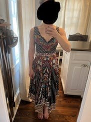 The pattern on this dress is so beautiful and the way the fabric flows made me feel super elegant at an outdoor wedding. However!! I had to wear the dress partially unzipped in the back (much to the horror of my sweet, sweet boyfriend) because the size 2 was *so* tight in the ribcage area, and I didn't give myself enough time to have the next size up delivered before the wedding. If you have even the slightest bit wider ribcage, or if, like me, you enjoy a heavy meal along with many cocktails and at least 2 pieces of wedding cake, I would recommend sizing up. But with that being said, please let the fact that I wore this dress unzipped be a testament to how much I loved it. It's really beautiful and I got a ton of compliments.
