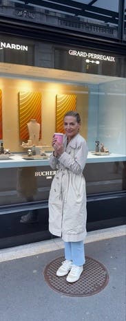 Wore this in Paris and London. I got the size 6 when I think I could have done the 4 but it was the only size available. It helped get me the look I was going for, but it was a bit bulky. Shoulders have pads in them and the straps are attached at the back so you can't tie them at the back so cinch your waist. However, it was the perfect layer I needed and was great for the London rain.