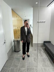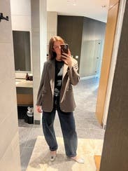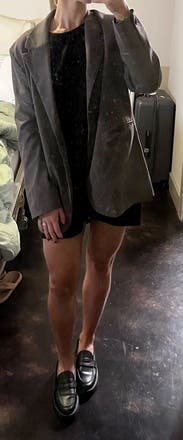 The dark mushroom gray was institutional chic in the best way, but the intended oversized fit with boxy silhouette looked best with casual fits (jeans and a tank) and wasn't a blazer I felt comfortable wearing to the office. Would rent again for pairing with jeans and boots. Extremely comfortable and held up well after a light steam.