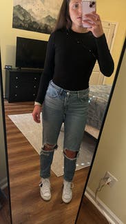 I wore this with a black skirt and it was really cute. However, it is really hard to get on because it runs small. Once it was on, it looked great, but I'd size up next time.