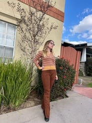 I like the brown 70s velvet flare vibe of these. I wish I had pinned them before I went out. It was a little tight in the thighs when I first tried them on, but then it was fine.