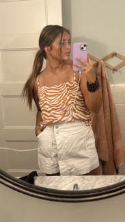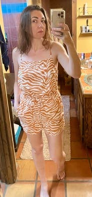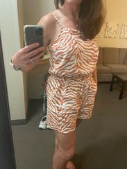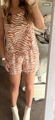 I wore this to a hot Auburn football game, and it was perfect! I could’ve worn it with sneakers but decided to dress it up a little with the boots and it was so cute. The top has adjustable straps and the shorts have a tie waist, so that was very forgiving. Got so many compliments!