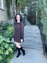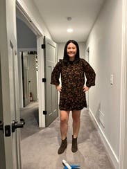 Such a fun dress. Wore it with tall suede boots. Perfect for a fall wedding.