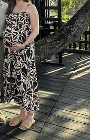 I wore this 9 months pregnant at the size I would normally wear! It was a great dress and big bump friendly