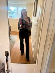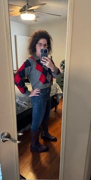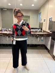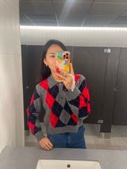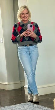 Got lots of compliments on this super cute argyle knit that is very cropped but works well with high-waisted pants or skirts. Equally cute with jeans and sneakers or dress pants. I like that it is different with the pattern and still feels like a classic piece.