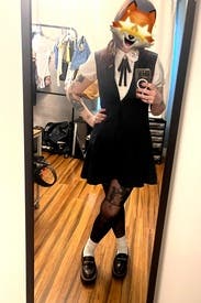 Really liked this dress/ frock. It’s not very shapely, like it doesn’t hug the body, but if you size down one I think it helps. This was my second time renting it. I found it a little short and had bike shorts underneath. It’s got a very school uniform feel which I liked. Very nice material. Heavy but not too heavy.