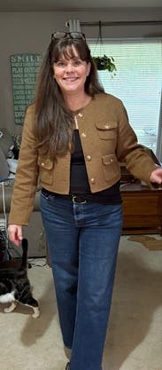 Loved this coat/blazer because it's fitted in arms but a little boxy in the body and I liked the shorter length. Plus with the no collar it's perfect to wear this collared sweater under.
