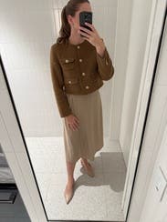 Flattering length that hits perfectly with high waisted trousers. Beautiful button detailing. TTS. A bit warm but great for an indoor conference. Would rent again!