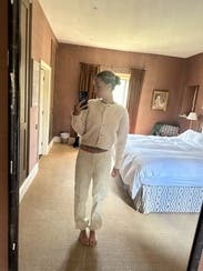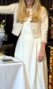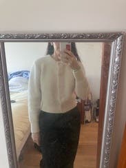 I can never get enough Sandro. Between the store and Rent the Runway, I end up purchasing so many of their pieces because it’s almost impossible to rent one and not want to keep it. This cardigan was no different. I’ll definitely be buying it. Yes, it’s “just” a cream cardigan, but it feels special. I’ve been holding out for one like this instead of settling for something ordinary. The feminine shoulder detail gives it a little drama, and the plush knit feels cozy and elevated. If you have very sensitive skin, it might feel a bit itchy, but it didn’t bother me at all. The length is spot on, perfect for draping over your shoulders in cold A/C. It’s too warm for outdoor wear unless the weather’s really chilly, but indoors it’s ideal. The cream color is beautiful, and honestly, Sandro doesn’t miss when it comes to cardigans. This might be my favorite category they design. Also, the whole outfit I’m wearing was rented from here and I would recommend it! All 3-pieces went so well together.