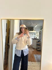 A beautiful sweater. Loved the color, thickness of the material, style. The shoulder is very slightly puffed but I didn’t find it to be exaggerated at all, and I even sized up so it was slightly relaxed/oversized overall (I mostly wanted to wear it buttoned up and didn’t want it to look shrunken).