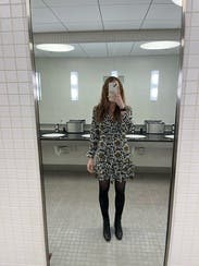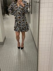 I have become a big fan of silky, long sleeve dresses like this for work. Maybe slightly more casual than what I would have worn pre-COVID but still feels out together. The sleeves on this one are puffy, which I hear is in style for the fall. Even though I'm short, I have a long torso. I thought it was cut too short in the waist and the top of the ruffles hit on my butt instead of right under, where I think it should have. The material was also a bit stiffer than I would have preferred.