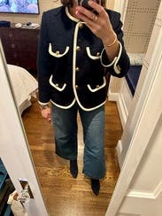 This is navy, not black. It’s the perfect jacket to dress up or down and show up looking put together and expensive. A great three-season piece in my mind.