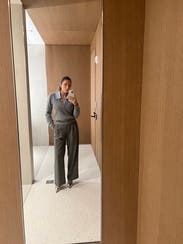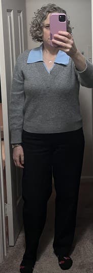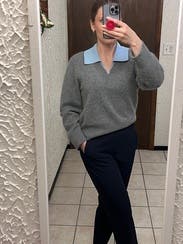 This is the perfect work sweater! The collar is attached and instantly makes you look put together & polished. I found it ran a tiny bit small and would recommend sizing up if you’re between sizes