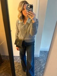 Love this sweater, runs a bit short if you are tall, perfect crop for my 5’4” . Low cut jeans in this picture and it still works.