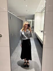 Absolutely adored this top - it's super chic and polished, but I sized down so it was a little cropped on the arms and length but I liked it that way. Felt less stuffy and more young. Great for work with a higher-waist jean or a dinner with friends!