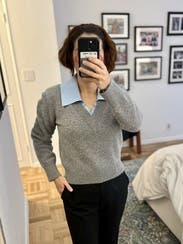 This Sandro sweater features a contrasting light blue collar that adds a preppy touch to the classic grey knit. Pair it with tailored trousers and loafers for a polished, professional look.