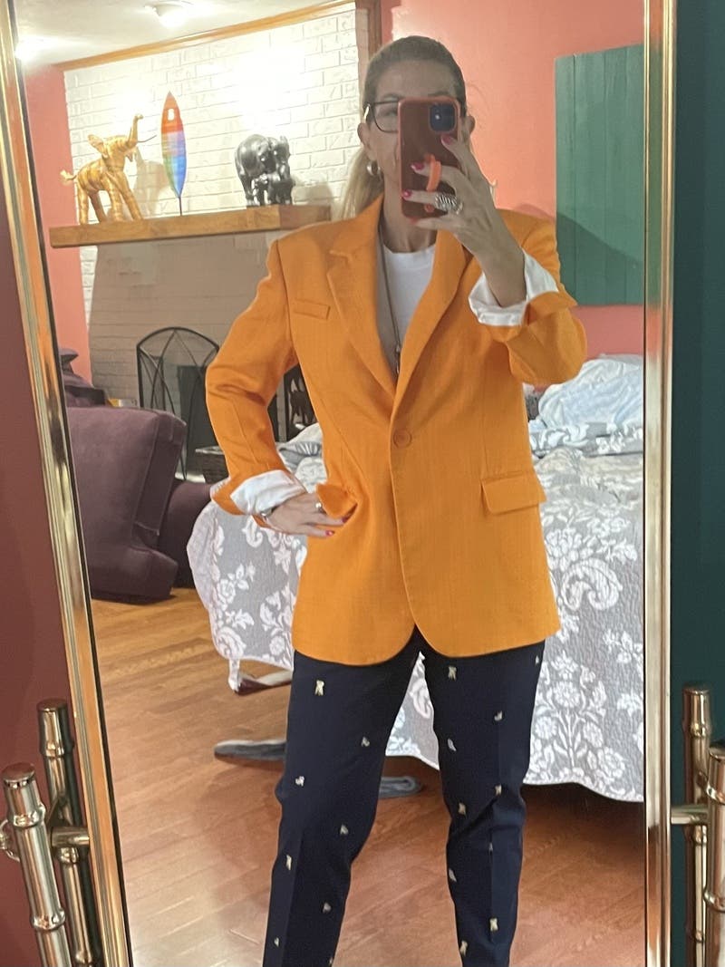 Orange crepe (100% Viscose). Lining (100% Viscose). Blazer. Long sleeves. Collar. Front button closure. 28" from shoulder to hemline. Imported.