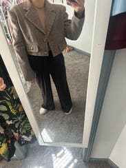 Looks like I’m drowning in it between the large shoulder pads and wide/long sleeves. Maybe if I would have sized down it would look less bulky on me. Cropped blazer that is thick material with a bit of stretch.