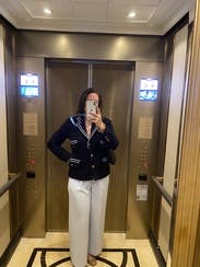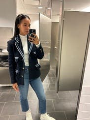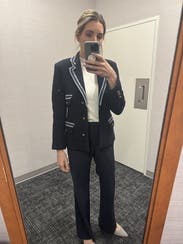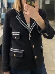A comfortable and chic Chanel inspired blazer that fits beautifully. Sleeves run a bit long but otherwise, loved it