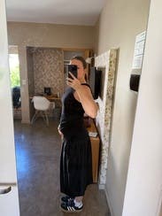 Trendy but classy with the midi length and dark color. Wore to work with valentino rock stud shoes and some gold hoops