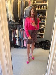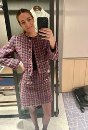 Super cute skirt with a 60s vibe. It’s actually more pink than red, and the weave on the tweed was much thicker than I expected (but not in a bad way). I wore to work with a black turtleneck and tights. I’m only 5’2” so the length on me was fine for work. If you’re between sizes I’d recommend sizing up, as there is no stretch to the material. There are a lot of different colors in the tweed so you could pair with a number of tops, and dress it up or down. Loved this one, would definitely rent again.
