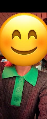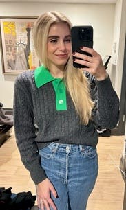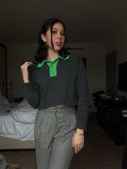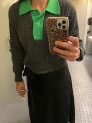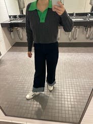 I wore this so much! Love the green contrast trim and the cropped fit. Looked good with all kinds of trousers/jeans but I could also see it working with skirts. The knit is pretty thick and is cozy and keeps its shape even after multiple wears.