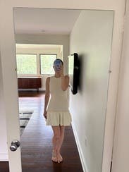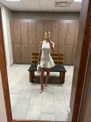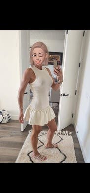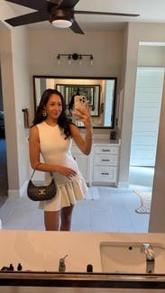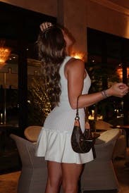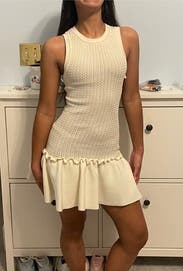 Absolutely obsessed with this mini dress. The top fits like a glove in all the ways I desire. I personally was able to go bra-less. And I adore the ruffle flare at the bottom. Couldn't recommend more