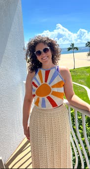 This top is so fun! I wore out on a date with my husband and instantly got compliments from ladies at both stops we made. I’ll admit I was a little unsure of the fit but after the praise it must have looked just right! I’m super tempted to keep and just may! I am not wearing a bra (and usually don’t) but think I might like to find a strapless for it. It does smoosh my boobs a bit and you don’t want that bc it then changes the look of the sunburst, haha. I lifted my boobs back in place a couple of times. So have a bra to hold them might be good BUT I do wonder if a bra will fit underneath as it’s a fairly snug fit already. I think I probably could get away with size up as well!