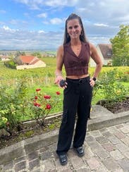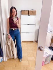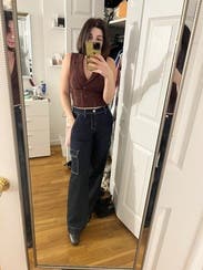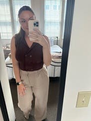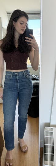 Wore a few different ways, and it was cute each time. Perfect if you have a short torso. Wore with work pants, jeans, and linen pants!