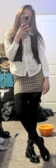 Love this cropped vest paired with a black denim skirt. Felt chic and on trend.