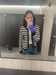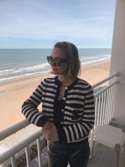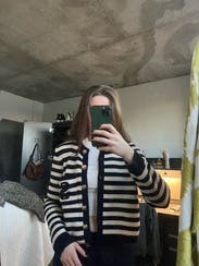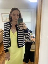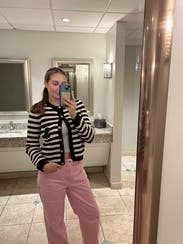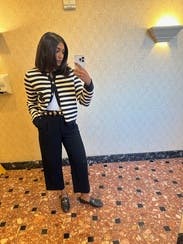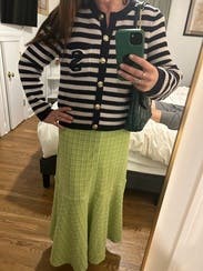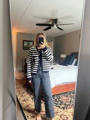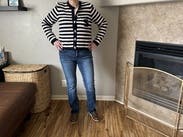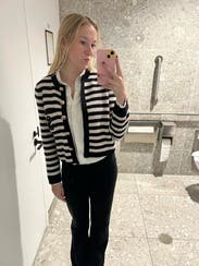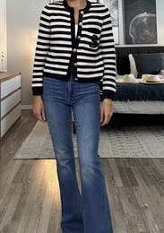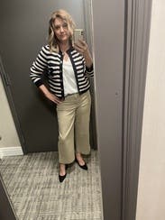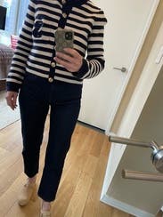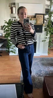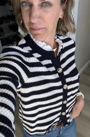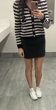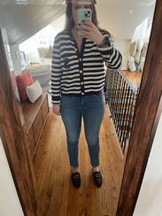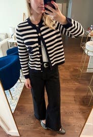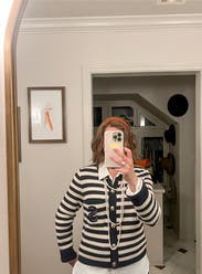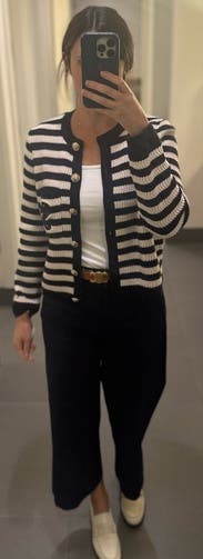 I ordered this sweater to pair with more casual looks, but inspiration struck to wear with a formal gown for a wedding. Because of the gold buttons and fitted look, it looks more expensive than your average blue/white striped sweater. Rather than going with the black blazer I planned on wearing, I wore this sweater over the gold evening gown. The white matched my pearl necklace and earrings, and the gold buttons tied in the gold tones from the dress. I’m excited to pair with jeans and a white T for a more casual look as well. Sandro has never let me down.