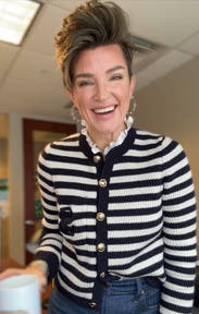 Prep school aesthetic goes coastal chic in this monogrammed contrasting stripe cardigan by Sandro. Style this buttoned-up knit sweater with your favorite trousers for work.