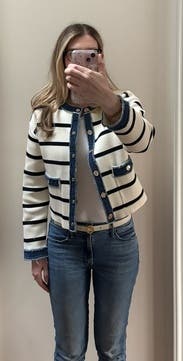 This cardigan style jacket has a denim border which is perfect for pairing with anything denim on the bottom. IG @bethielife