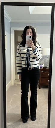 I love this! Well-made sweater! It would be beautiful with jeans but it's just too hot outside right now! I didn't know how thick this material was. I'm able to wear it at work since it's usually cold with the air conditioning. It did run big. They recommended a 4 and I rented a 3 based on the reviews. A three was even a bit big. I still don't know if the stripes are black or navy. So I guess it could go either way 😉