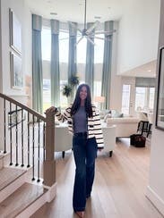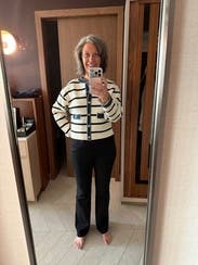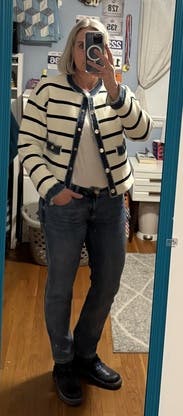 This was a fun piece to wear to work (business casual office with jeans appropriate). I styled with dark wash denim and a fitted black shirt. I had not rented this designer before, so I hedged and got a larger size because jackets are usually tight in the arms for me. I could have done my smaller size. The cream and black fabric is stretchy (and heavy) and the overall cut is very forgiving. Looked great on my Zoom call! Will rent again.