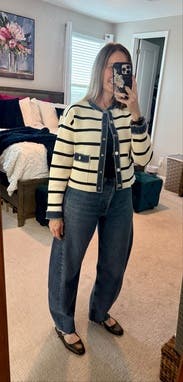 I wear this almost every day of my work trip to Barcelona and London. It was perfect for travel days just to elevate a comfortable outfit to look really put together. The denim detail is such a fun addition and the material is super soft. It feels like you’re wearing a sweater.