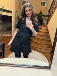 Nice details like gold buttons and hemline ruffles make this tweed dress fun