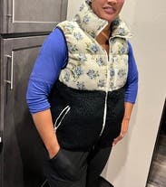 I've enjoyed wearing this over a basic top with jeans and sneakers. Eye-catching pop of floral fabric helps this oversized vest standout and give the vest a cute touch!