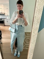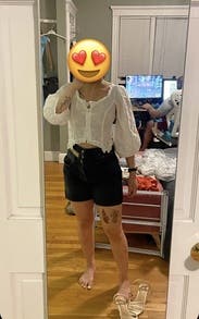 This is basically my go-to summer pairing: Sandy Liang top + jorts! This top is just perfect— feminine but with a bit of the unexpected with underarm cut outs. The size 2 fit me perfectly— fitted but with breathing room. For reference my bust is 33in at the fullest point, and my waistline is 24.5in.