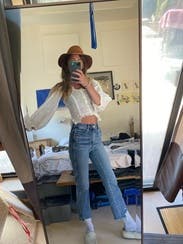Wore for a concert/date night with high waisted light wash jeans and a bralette. It is pretty cropped (right above belly button). The sleeves and bottom give it some interest over a run of the mill eyelet. Would rent again.