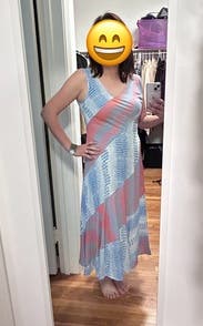 Wasn’t sold on this dress to be honest but ended up liking it for the night. The cut is a little loose around ribs so there’s no real shape (had to wear a real bra - which I hate - but gave me more of a figure). Very light material so really was nice for an outdoor summer wedding!