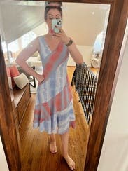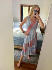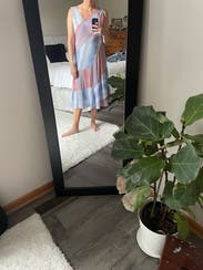 Love the different cut of the neck line and bottom. Super comfy while still a little dressed up. Wore on vacation and rented again for a pre-wedding party.