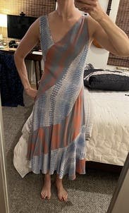 Dress is cut on the bias, which is flattering. Neckline is nice. Very thin material. My waists is a little thicker and I’m not sure it was perfect for me. Also, 5”10 so good for tall ladies!