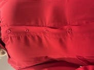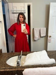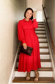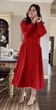 Beautiful dress with such a pop of red color. It just didn’t work for my 36C/D chest size. Loved the color so much, we used it for Christmas pics but if you looked too close, the buttons were pulling.