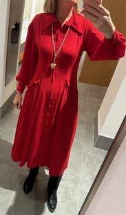 This is a beautiful dress with high quality fabric that doesn't require any steaming or ironing (huge plus). It lays really nicely on the waist/hips area. There's a little bit of western detailing that I liked. I paired with a black belt and ankle boots for a nice dinner out and got several compliments. I thought it could be perceived as a little matronly, but I zhuzhed it up with fun jewelry, the boots, and a fun colorful faux fur that made it feel a lot less "buttoned up" figuratively (but obviously not literally) speaking.